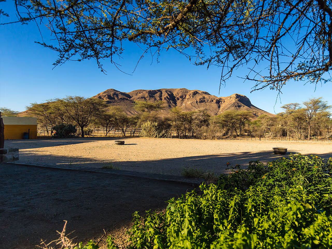 There are two options: a site exclusively for one group or a shared camping site. They're both 3kms away from the guest farm and have two showers with water heated up by a donkey - that is, a boiler fired with Namibian hardwood, which you buy from the shop. They have two flush toilets, two sinks and a dining lapa with a roof. So you get some shade. But no electricity. Meals and tours are available by prior request. The private site is suitable for up to ten people.