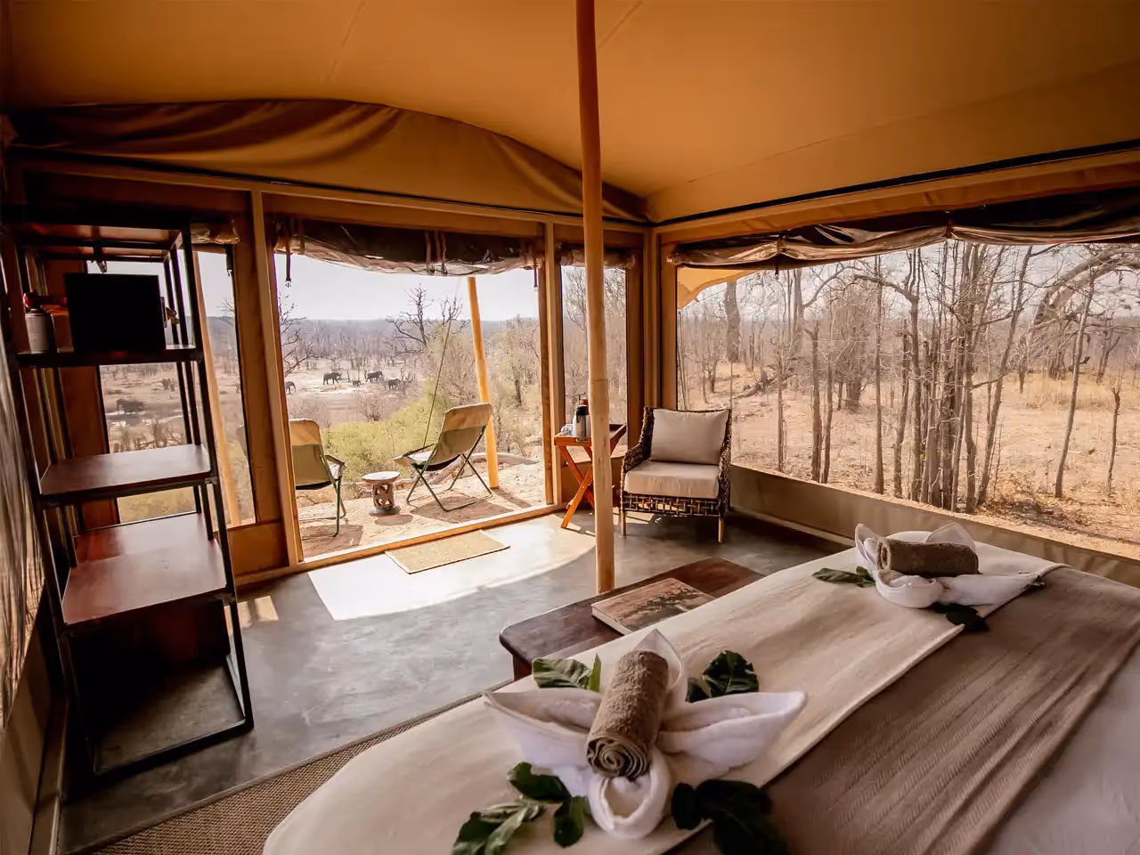 It’s perfectly possible to view game without raising your head off your pillow in your kingsize or twin bed, as you can enjoy floor to ceiling views from most areas of your tent.