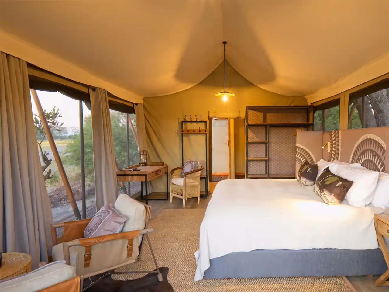 Built on low wooden decks, six spacious tents – including a family unit with two ensuite tents – are tucked away in a wooded peninsula. Shaded by leadwoods and sausage trees, each tent overlooks the shimmering floodplains and a well-trodden game path to the water. The simple interiors feature references to the iconic Hambukushu basketry of the northern Okavango throughout the bedrooms and lounge, with the adjacent bathroom and indoor and outdoor showers maximising the views.