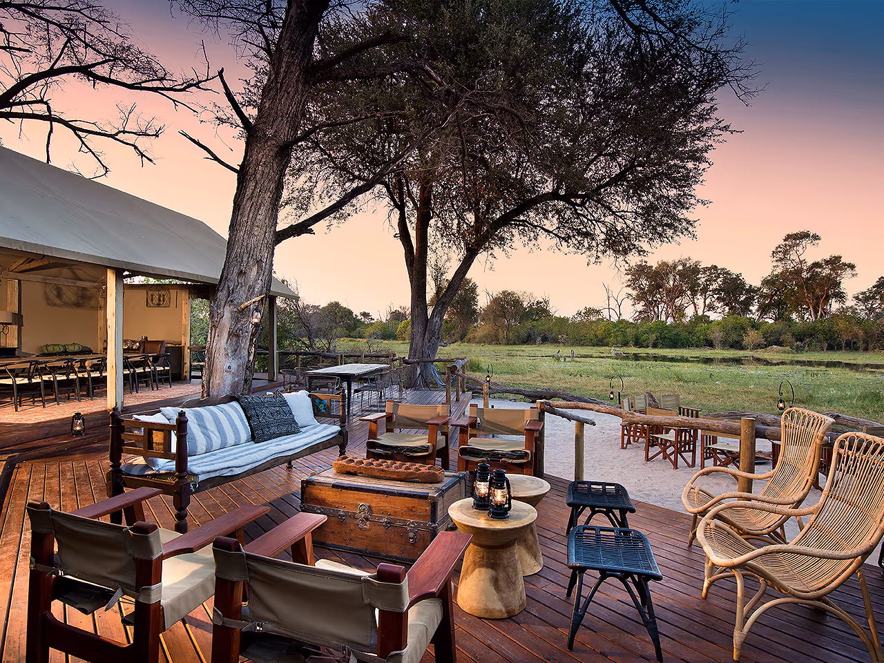 The bathroom - a private extension of your tent - has a flushing toilet and a hot-water bucket shower with a jug of water supplying your hand basin. In front you have a large shaded patio overlooking the Khwai River.
