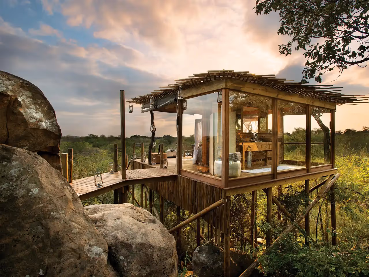 Surrounded by a sea of boulders and trees, Kingston Treehouse offers complete seclusion and views across untamed wilderness from a contemporary raised structure built entirely from wood and glass. Solar-powered and sustainably designed, it features a large viewing platform with plush seating, a queen bed, and a glass-ensconced bathroom, with lanterns adding a gentle glow come nightfall.