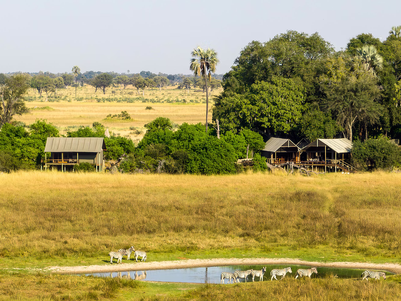 With the isolation comes peace, quiet and beauty, provided by the lagoons, floodplains, grasslands and forests. And you won’t be surprised to learn that given its remoteness, the camp is accessible only by a half-hour helicopter ride from Maun.