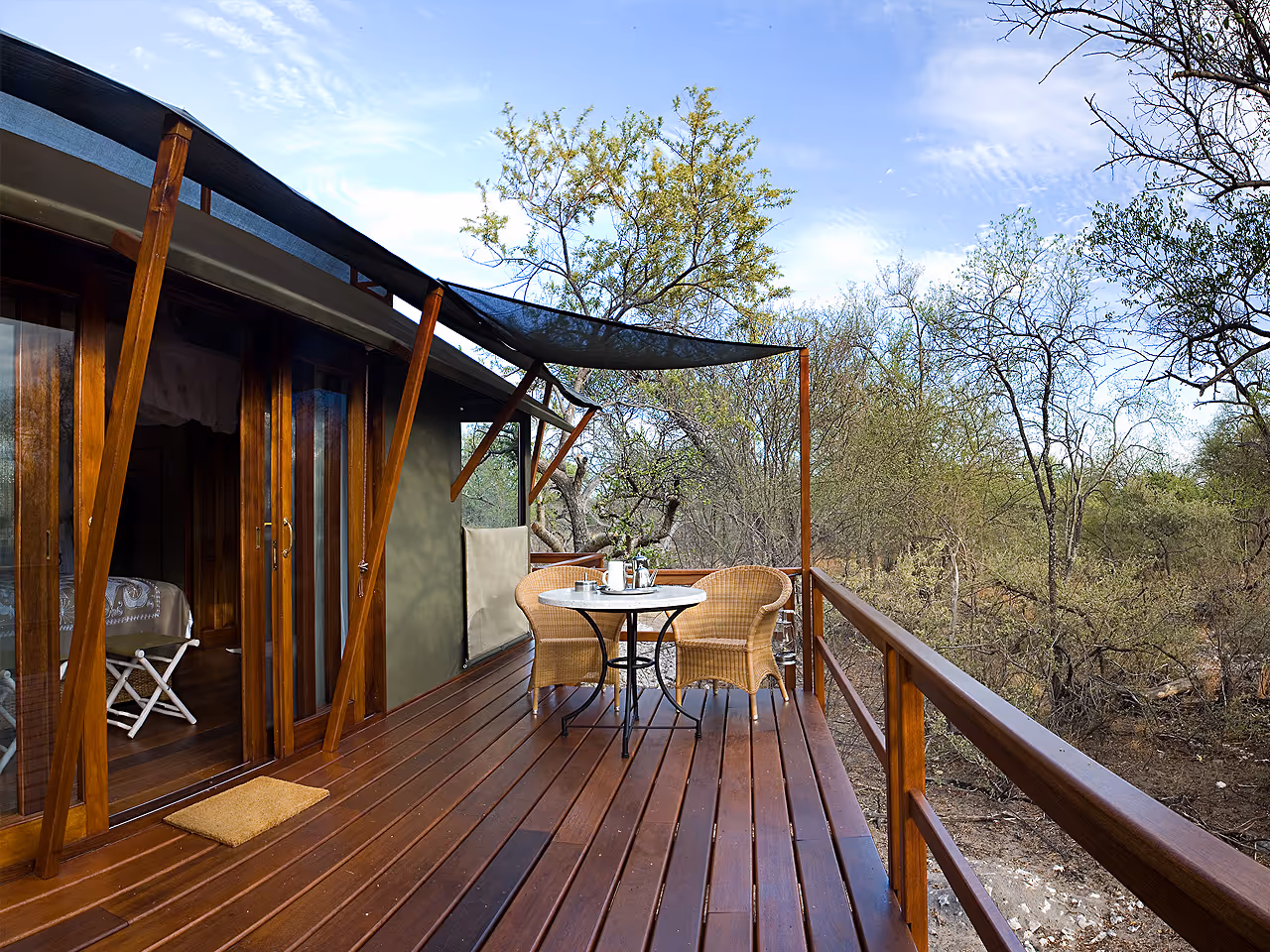 Accommodation at Mushara Outpost is paired down luxury with eight chalets built on elevated decks with canvas roofing, floor-to-ceiling glass doors, en suite bathrooms with enclosed toilet and an open-plan shower with a cheeky private view of the Namibian bush.