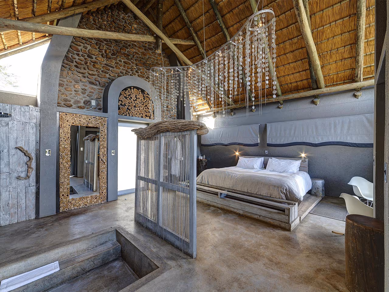 And the accommodation is pretty darn swish, we might add. The villas have all the textures and colours of a typical San village and you could probably fit a whole San village inside them. The chalets are somewhat more discreet but no less comfortable. Built of local stone under local thatch all chalets and villas have air conditioning, en suite bathrooms, luxury beds and plenty of privacy, though, surrounded by a small county of African bush, that won’t be a major concern.