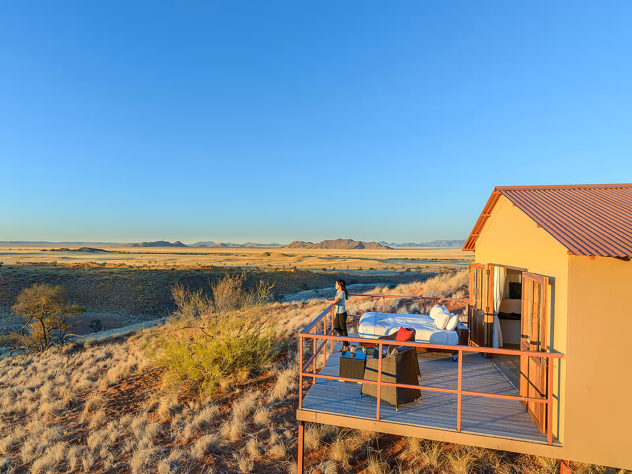 The deck, perched above the dune like a diving board in Kolmanskop, fits your queen-size bed (on wheels; with brakes you’ll be happy to know) inviting you to spend a glorious night under the Namibian desert starscape. An en suite bathroom with solar-heated shower and flushing toilet completes the necessities but, in one of the country's most romantic rooms, that single bed is a bit of a puzzle.
