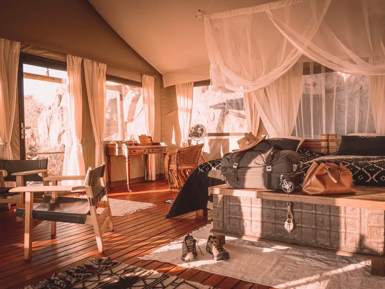 Ohorongo Tented Camp is dedicated to sustainability and conservation, integrating eco-friendly practices into every aspect of its operation. The camp’s design ensures that its canvas tents blend seamlessly with the natural landscape, minimising environmental impact while providing modern comforts. Located among granite boulders, the camp uses solar panels and water-saving fixtures to support its green initiatives. As a non-profit, Ohorongo Tented Camp reinvests all proceeds into fostering lasting biodiversity and supporting local communities. This commitment to sustainability and community upliftment ensures that every guest experience not only connects them with nature but also contributes to preserving Africa’s natural heritage and benefiting the surrounding area.