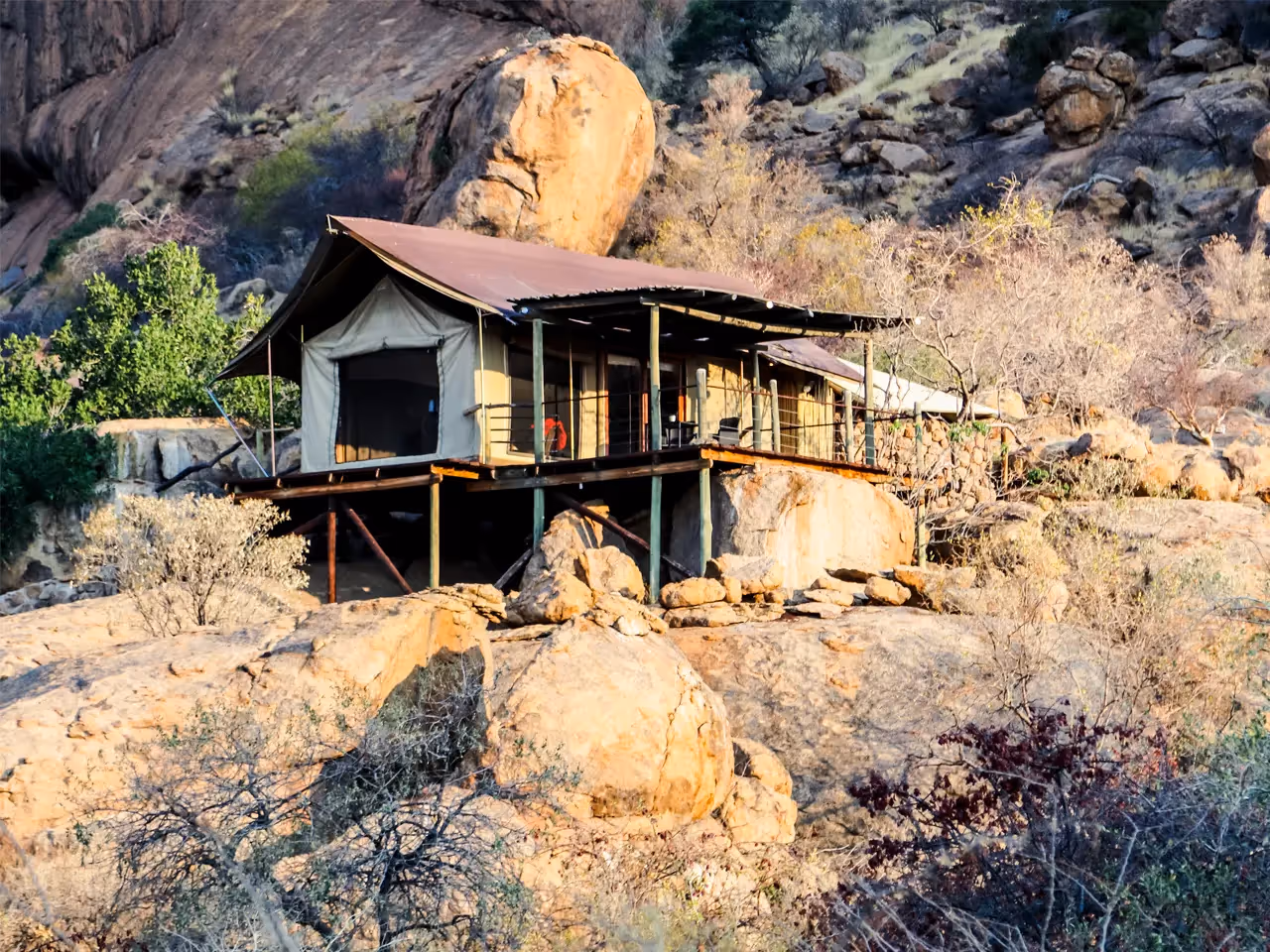 Ondudu Safari Lodge for its beautiful setting, tented chalets and friendly service, is a fine example of Namibian hospitality. Built in and around hulking granite rocks, the lodge features spectacular views of the Erongo Mountains and a tranquil atmosphere.