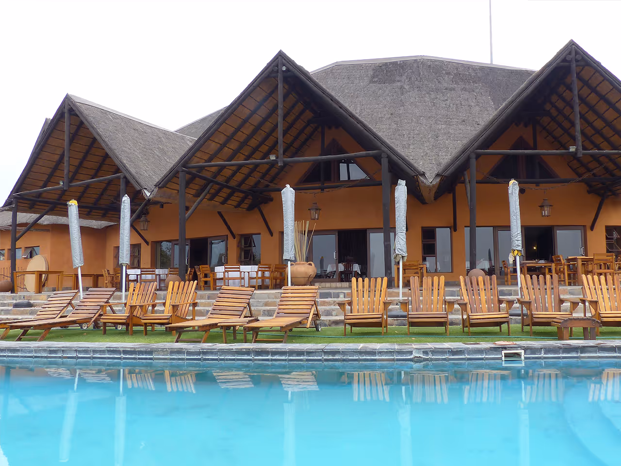 The main living area houses the bar, restaurant, lounge, wine cellar, curio shop and a large verandah with a view that starts at the pool, sweeps over a mopane-covered valley, and ends in a haze of mountains.