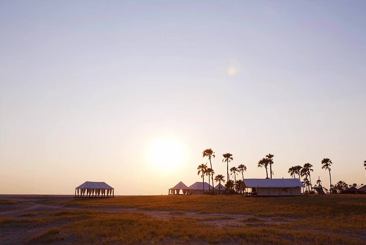 Welcome to one of the most remote locations in Botswana. It’s surrounded by, well, not a lot, bar a few palm trees scattered here and there. And that’s the appeal. This is escapism pure and simple. A small camp with just seven tents providing accommodation on the edge of the Nwetwe Pan in the Kalahari.