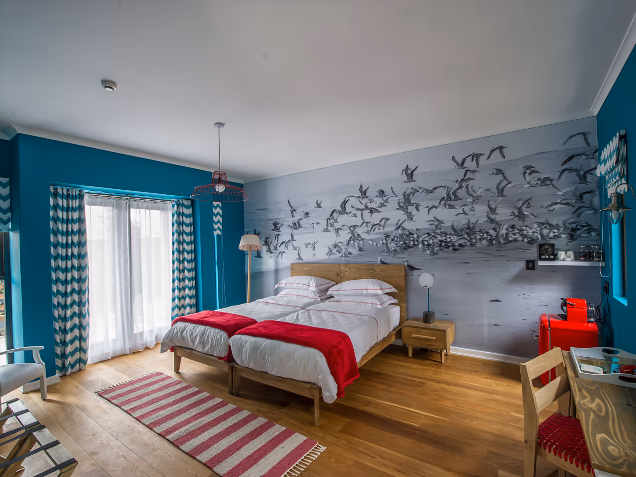 Back to the hotel. Taking its colourful cue from the lighthouse framed by that grand entrance and of course the sea over which it casts its beady eye, The Delight is a lively seltzer for the travel-weary. Wood-finishes contrast with a dizzying display of almost-turquoise, nearly-red and bright, textured detail every which way you turn. Even your Smeg fridge and Nespresso coffee machine are colour-coded while the patterned turquoise walls are tamed by a tasteful black-and-white backdrop of Namibian scenery.