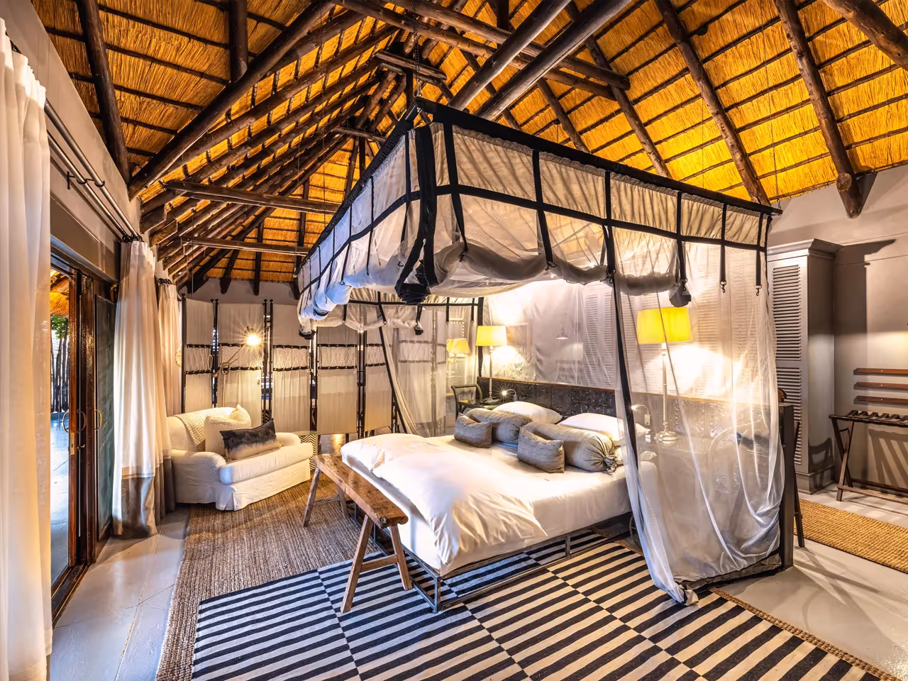 Comprising two secluded private villas tucked away from the main lodge, decked out in finest African chic, every detail has withstood scrutiny from designer Heidrun Diekmann and the result is flawless. Large verandahs have designer plunge pools, recliners and a thatched-roofed day bed from where you can watch the wildlife munch its way past.