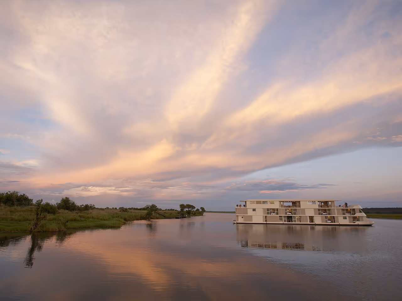 Unique and private accommodation with endless game viewing opportunities experienced from the comfort of your bed, lounging in the sun or dining on this exciting floating safari.