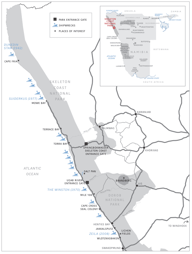The Skeleton Coast is famous for its shipwrecks, some stranded kilometres inland as sand dunes slowly swallow them over time. A few of the most iconic include: